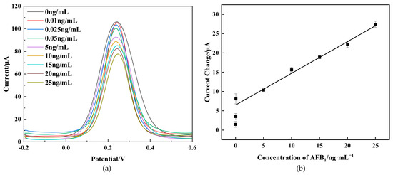 As depicted in Figure 6a, the DPV peak currents exhibited a notable decrease with an increasing AFB1 concentration within the range of 0–25 ng/mL. This decrease can be attributed to the heightened hindrance of the immunocomplex to electron transfer. As depicted in Figure 6b, the current change () before and after immunization displayed a linear relationship with AFB1 concentrations from 0.05 ng/mL to 25 ng/mL, with a low detection limit of 0.021 ng/mL (). The limit of detection () was determined using the regression curve parameters, , where “” represents the ard deviation of the blank sample and “” represents the slope [36].The calibrated regression equation is: