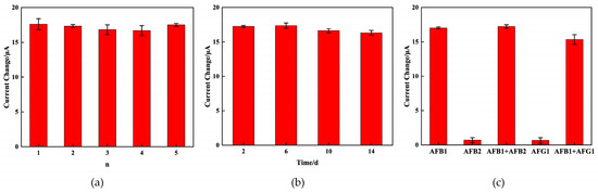 The specificity of the prepared immunosensor was also crucial for assessing its performance. The specificity was evaluated using interfering substances, which consisted of 15 ng/mL of AFB2 and AFG1. As observed in Figure 7c, the peak current change () before and after immunization with pure interfering substances exhibited no noticeable variation. The observed peak current change () before and after immunization with the mixture solution showed similarity to that of the 15 ng/mL AFB1 standard solution. All the above observations demonstrate that the immunosensor exhibited a commendable level of specificity.