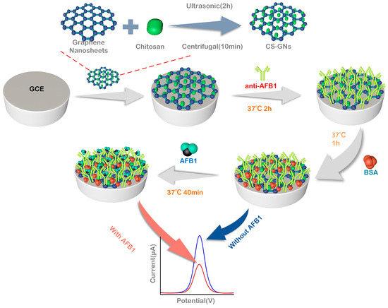 In conclusion, the application of graphene and its modified materials in electrochemical immunosensors has provided a new approach for the detection of AFB1. These studies have laid the foundation for the development of more sensitive and highly selective methods for detecting AFB1, holding significant importance in the field of food safety [19,20]. Additionally, graphene has significant advantages due to its large specific surface area and high conductivity for electrochemical biosensors. However, it is naturally hydrophobic and tends to aggregate in hydrophilic solvents [21]. Due to its excellent film-forming properties and effective dispersion effect, chitosan has emerged as a popular dispersant for graphene [22]. Furthermore, chitosan exhibits excellent biocompatibility and the ability to immobilize various functional groups, rendering it a desirable substrate for the immobilization of biosensors [23]. In this work, CS-GNs nanocomposites were synthesized and immobilized on glass carbon electrodes (GCE). Chitosan, known for its biocompatibility, was utilized to immobilize the AFB1 antibody, thereby enhancing the specificity of the sensor. Through this approach, a straightforward, effective, and exceptionally precise electrochemical immunosensor was constructed and utilized for the detection of AFB1 concentration in actual corn samples.
