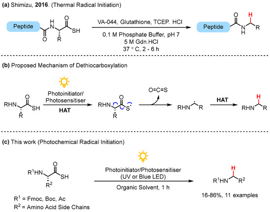 (a) Previous work by Shimzu and co-workers [14]; (b) proposed mechanism of radical dethiocarboxylation; (c) photochemical dethiocarboxylation.