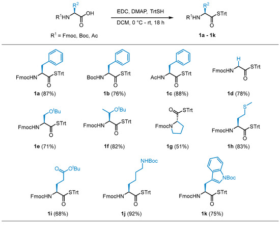 With the optimized conditions in hand, STrt thioesters 1a–1k were prepared in good yields from commercially available and suitably protected amino acid derivatives (Scheme 2). The STrt thioesters were deprotected by treatment with varying concentrations of TFA, depending on whether concomitant deprotection of the N-terminal and side chain-protecting groups were also required to furnish the required thioacids (Section 3.4). The thioacids were concentrated in vacuo following deprotection and used promptly without further purification.
