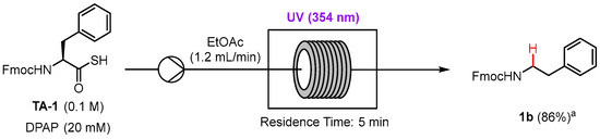 In recent years, there has been growing interest in academia and industry in the application of photochemical reactions to continuous flow to increase reaction selectivity, efficiency, and productivity [18,19]. The scaling up of photochemical reactions in batch can suffer from low yields due to poor light penetration, which is easily overcome in flow as the narrow tubing ensures uniform irradiation of the reaction mixture [20]. With this in mind, we set out to investigate whether the photocatalyzed dethiocarboxylation was compatible with flow. The model reaction used for the batch optimization with the dethiocarboxylation of Phe thioacid TA-1 was applied to flow using UV irradiation since we wanted to minimize reaction time and increase throughput. Gratifyingly, N-Fmoc phenethylamine 2a was isolated in an excellent yield of 86% with 5 min residence time of the reagents under UV irradiation on a 1 mmol scale (Scheme 4). This result demonstrates compatibility of the dethiocarboxylation reaction with flow and the potential scalability of the process.