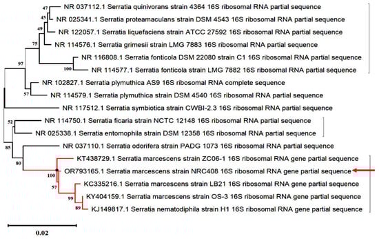 The bacterial strain NRC408 recorded the highest specific activity of chitinase (250 U/mg). The 16S rRNA gene of NRC408 was efficiently amplified during the PCR reaction using the universal primer pair—8f and 1429R—resulting in a 1551 bp sequence. This nucleotide sequence was aligned with all currently available 16S rRNA sequences in the GenBank database (https://www.ncbi.nlm.nih/gov/genbank/, accessed on 10 November 2023). The alignment of the strain’s 16S rRNA gene and a subsequent database search disclosed a remarkable 99% identity with Serratia marcescens strain Gol3 (sequence ID: MT263018.1). Utilizing the neighbor-joining (NJ) method, phylogenetic trees were constructed, as depicted in Figure 1. The tree analysis confirmed that the NRC408 strain falls within the genus Serratia. Following submission to GenBank, the bacterial strain NRC408 was assigned the accession number OR793165 and defined as Serratia marcescens strain NRC408.