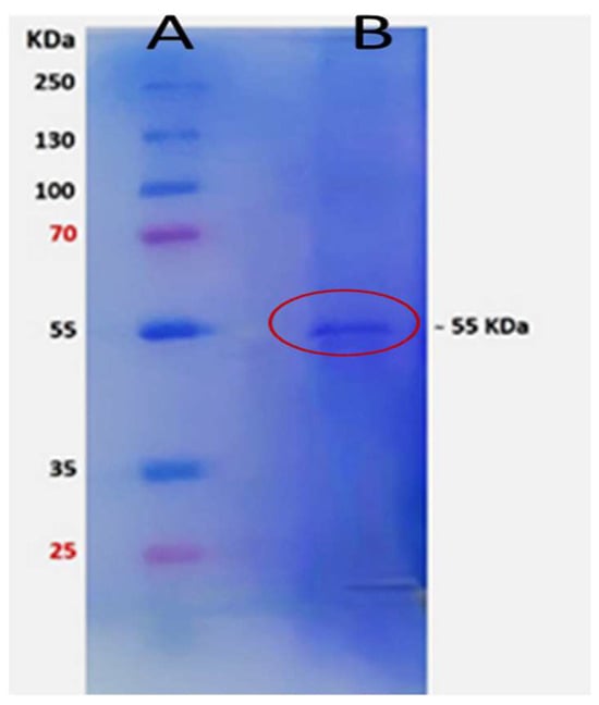 SDS-PAGE of partially purified rHis6-ChiB. Lane A: low-molecular-weight protein ladder from Thermo Scientific™, Waltham, MA, USA; Lane B: protein band with a molecular weight of 55 kDa, indicating chitinase B and marked by a red circle.