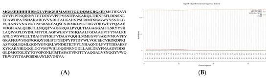 - Almagro Armenteros, J.J.; Tsirigos, K.D.; Sønderby, C.K.; Petersen, T.N.; Winther, O.; Brunak, S.; Von Heijne, G.; Nielsen, H. SignalP 5.0 improves signal peptide predictions using deep neural networks. Nat. Biotechnol. 2019, 37, 420–423. [Google Scholar] [CrossRef] [PubMed]