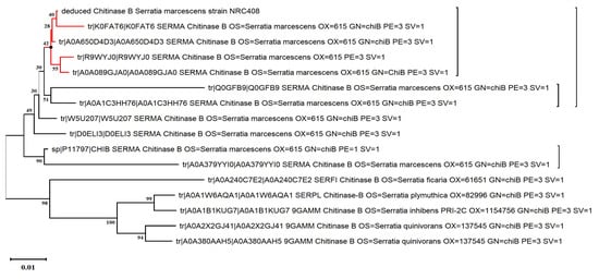 Phylogenetic tree based on a comparison of the deduced ChiB amino acid sequence (indicated by a red arrow) and its closest phylogenetic relatives retrieved from the uniprot database. The tree was reconstructed by the neighbor-joining method using MEGA 11 software. The numbers on the tree indicate the percentages of bootstrap support derived from 1000 replications.