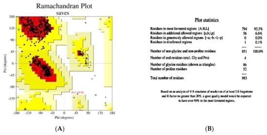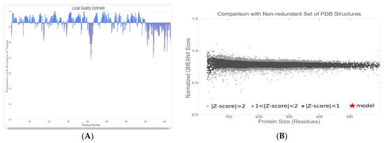 The authentication of the modeled protein structure was conducted using the ProSA server (https://prosa.services.came.sbg.ac.at/prosa.php, accessed on 22 November 2023) and SAVES v6.0 (Structure Analysis and Verification Server version 6), which test the atomic coordinates of the structure—the 3D model—to assess its structural quality. SAVES v6.0 comprises five programs designed to assess the general coherence of a protein’s structural arrangement. Among these programs, PROCHECK [60], VERIFY-3D [61], and ERRAT [62] scores were employed to evaluate the 3D protein models, while PROCHECK including Ramachandran plots and Ramachandran statistics was employed to evaluate the model’s quality by examining the allowed and disallowed regions on the plot [44]. The ProSA web server generated a Z-score value, providing an indication of the overall quality of the model and its similarity to native nuclear magnetic resonance/X-ray crystal structures [43].