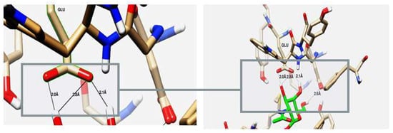 As shown in Table 2 and Figure 10, the ligand, chitin, forms two hydrogen bonds through its two hydroxyl groups inside the binding pocket of the chitinase B protein. Both hydrogen bonds act as hydrogen bond donors (HBDs) with the oxygen of Glu 144, having bond lengths of 2.0 Å and 2.1 Å and an angle of 150.90°, with an interaction affinity score of −5.71 kcal/mol. When visualizing the interaction with Chimera, four hydrogen bonds were observed. However, hydrogen bonds with lengths greater than 2.5 Å were not considered due to their weakness and their angles of 106° that cannot be considered, as the optimum angle is between 120° and 180°. Table 3 illustrates the formation of hydrogen bonds between chitin as a substrate with the S. marcescens chitinase B active site.