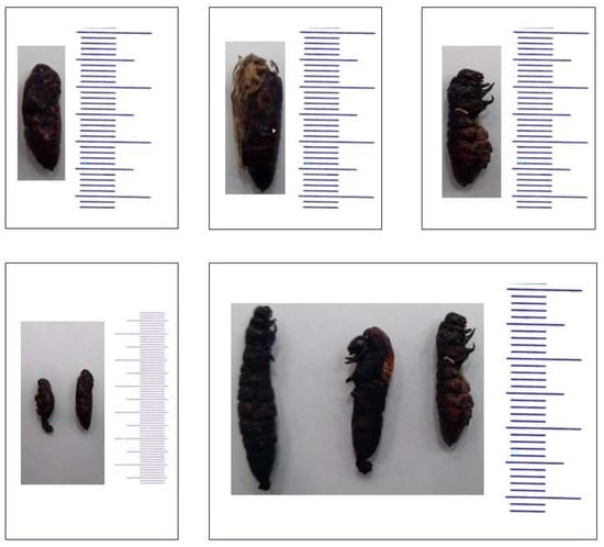 Recombinant chitinase B induced 92.75% mortality and significantly prolonged the pupal period (16.31) compared to 11.35 and 13.45 days in the control and emamectin benzoate groups (Table 4). Three days post-treatment, S. frugiperda larvae began to display decreased appetite when compared to the untreated larvae, and a significant reduction in larval weight was observed. The pupation rate, including both eclosion and hatching rates, was significantly influenced following larval treatments. Recombinant chitinase B treatment significantly delayed the pupal period and increased adult longevity. Treatment with chitinase B induced larval, pupal, and adult malformations (Figure 11). Larval deformities included small size and distortions. Larval–pupal intermediates were also observed. Pupal malformations included the presence of small-sized pupae with degenerated appendages detached from the integument. However, adult malformations included folding and crumbled wings as well as small size.