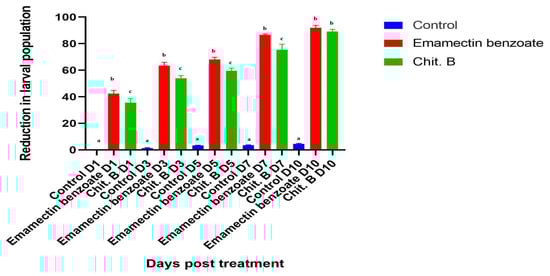 The effectiveness of chitinase B against S. frugiperda after spraying in the El-kilo 56 district, Behera Governorate, is illustrated in Figure 12. The obtained results indicated that a significant reduction was obtained following treatment. The highest percentage reductions in larval pupation were achieved at 7- and 10-days post-treatment, by 75 and 88.66%, respectively, compared to 86 and 91.3% in the emamectin benzoate-treated group at 7 and 10 days post-treatment, respectively.