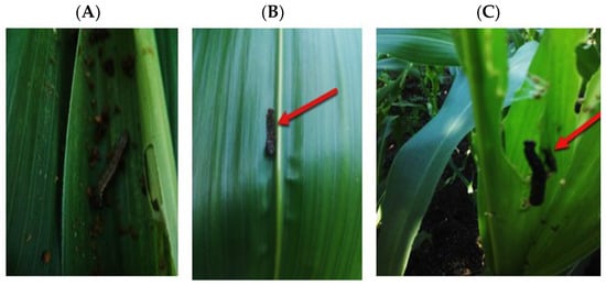 Infested corn fields with S. frugipedra. (A): healthy larvae, (B,C): infected larvae from which the pathogenic bacteria, Serratia marcescens, were isolated.