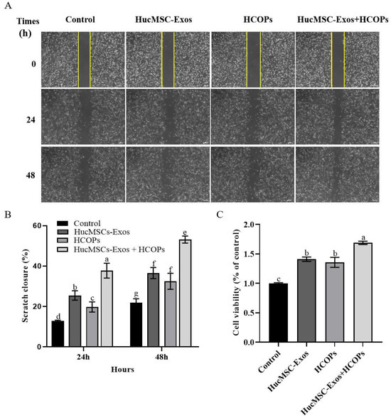 2.4. Combined Effect of HCOPs and HucMSC-Exos at the Selected Concentrations on the Proliferation and Migration of HSFs