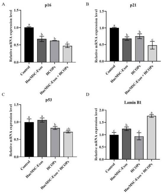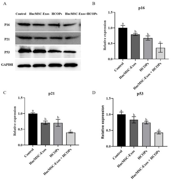 2.7. Combined Effect of HCOPs and HucMSC-Exos at the Selected Concentrations on Senescence-Associated Regulators