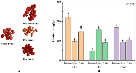 Feature (A) and phytochemical profiling (B) of Cornus officinalis fruits. TFC, total flavonoid content; TPC, total phenolic content; TAC, total alkaloid content; different letters (a, b, and c) above the column diagram indicate significant difference among three groups (p < 0.01) for the indicator.