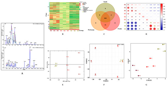 Secondary metabolite profiling of Cornus officinalis fruits: (A) total ions chromatogram of different quality control samples using multiple reaction monitoring; (B) hierarchical cluster analysis; (C) Venn diagram; (D) correlation analysis; (E) principal component analysis; (F), non-metric multidimensional scaling; (G) uniform manifold approximation and projection. TIC, Total ions chromatogram; +/− MRM, positive and negative multiple reaction monitoring; PC, principal component; P1, P2, and P3 represent samples from pericarps; S1, S2, and S3 represent samples from seeds; F1, F2, and F3 represent samples from fruits; ** in Figure 2D represents significant correlation (p < 0.01) and * represents significant correlation (p < 0.05); NMDS, non-metric multidimensional scaling; UMAP, uniform manifold approximation and projection.