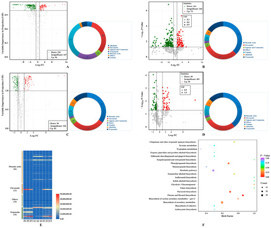 Differentially metabolites: (A) Volcano plot of differential metabolites between pericarps and seeds with fold change; (B) Volcano plot of differential metabolites between pericarps and seeds with fold change and p value; (C) Volcano plot of differential metabolites between pericarps and fruit with fold change; (D) Volcano plot of differential metabolites between pericarps and fruit with fold change and p value; (E) key differential metabolites between pericarps and seeds with fold change, p value, and false discovery rate; (F) enrichment analysis of KEGG pathways of differential metabolites between pericarps and seeds. Pie chart depicts the categories of the differential metabolites; P1, P2, and P3 represent samples from pericarps; S1, S2, and S3 represent samples from seeds; F1, F2, and F3 represent samples from fruits.