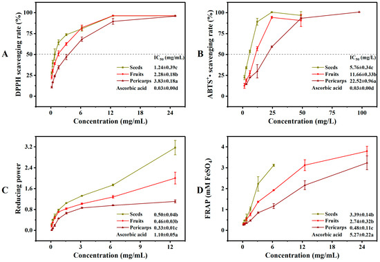 In vitro antioxidant activities of extracts from Cornus officinalis fruits, pericarps, and seeds: (A) DPPH radical scavenging activity; (B) ABTS+• radical scavenging activity; (C) reducing power; (D) Ferrous reducing antioxidant power. Different letters (a, b, and c) above the column diagram indicate significant difference among three groups (p < 0.01) for the indicator; IC50, the half maximal inhibitory concentration; DPPH, 2,2-diphenyl-1-picrylhydrazyl; ABTS+•, diammonium 2,2′-azino-bis (3-ethylbenzothiazoline-6-sulfonate); FRAP, Ferrous reducing antioxidant power.