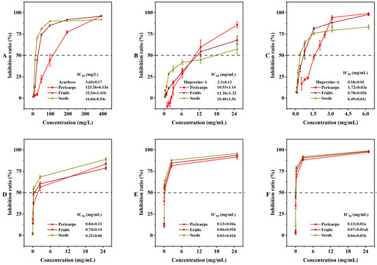 In vitro enzyme inhibition activities and cytotoxicity of Cornus officinalis fruits: (A) α-glucosidase inhibition activity; (B) acetylcholinesterase inhibition activity; (C) butyrylcholinesterase inhibition activity; (D) cytotoxicity against RAW264.7; (E) cytotoxicity against HepG2; (F) cytotoxicity against TE-1. IC50, the half maximal inhibitory concentration. Different letters (a, b, ab, and c) after the value indicate significant difference among three groups (p < 0.01) for the indicator.