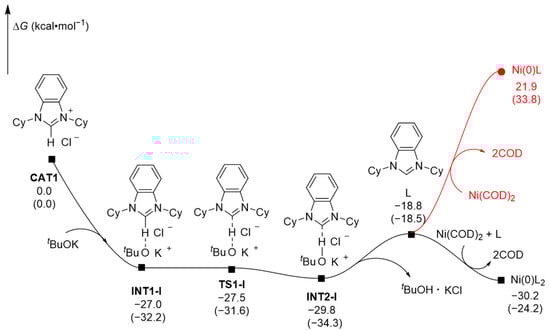 The NHC ligand is shown to be cable of capturing protons from alcohols and generating NHC-H+ plus alkoxy anions (R-O−) [25], which would be the reverse process of the pre-catalysis. To understand the interaction mechanism of the catalyst precursors with the base additive well, we conducted DFT calculations on the pre-catalysis process of the reaction (Figure 2). The catalyst precursor NHC·HCl (CAT1) can initially interact with tBuOK to form the intermediate INT1-I, which then undergoes hydrogen migration through transition state TS1-I, transforming into intermediate INT2-I via a near barrier-free process (ΔΔE = 0.6 kcal·mol−1, with a negative ΔΔG). Afterwards, INT2-I removes the tBuOK·KCl fragments and forms the NHC ligand (L), which then undergoes ligand exchange with Ni(COD)2 to exothermically generate the active catalytic species Ni(0)L2 (L = NHC), releasing 30.2 kcal·mol−1 of free energies. On the contrary, the formation of Ni(0)L is endothermic and requires an absorption of 21.9 kcal·mol−1 of free energies, indicating that the formation of Ni(0)L is almost uncompetitive to the formation of Ni(0)L2. Namely, Ni(0)L2 is more stable than Ni(0)L, confirming the active catalytic species in this reaction is Ni(0)L2 rather than Ni(0)L.
