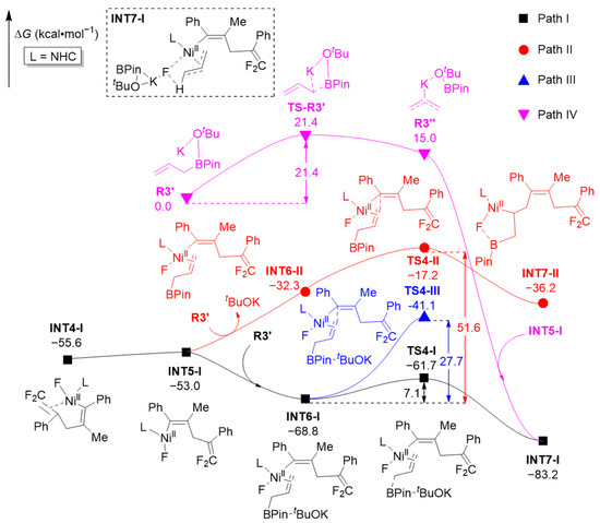 As shown in Figure 4, the five-membered ring intermediate INT4-I formed through the oxidative addition process can endothermically undergo C-C single bond rotation (ΔΔG = 2.6 kcal·mol−1) to convert into ring-opened intermediate INT5-I (M2 in Scheme 1), which is in a more favorable configuration for the subsequent formation of product P1. Intermediate INT5-I on Path I will then interact with R3′ (formed through interaction of the third component R3 with tBuOK, Figure 1) to form intermediate INT6-I, which then undergoes C-B cleavage through transition state TS4-I (ΔΔG = 7.1 kcal·mol−1) to form the more stable intermediate INT7-I. The whole process releases 27.6 kcal·mol−1 of free energies and should be easily achievable at an experimental temperature of 50 °C.