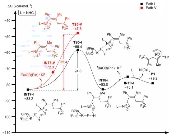 As shown in Figure 5, the intermediate INT7-I formed will undergo C-C coupling and reductive elimination through transition state TS5-I, overcoming a free energy barrier of 24.8 kcal·mol−1 and transforming into intermediate INT8-I. Afterwards, INT8-I removes the tBuOB(Pin)·KF fragment and converts to intermediate INT9-I. Finally, INT9-I interacts with ligand L and forms the product P1, accompanied by the regeneration and recycling of the active catalytic species Ni(0)L2 (L = NHC). If intermediate INT7-I removes the tBuOB(Pin)·KF fragment and transforms to INT8-V (M3 in Scheme 1) first (Path V), the following C-C coupling and reductive elimination process must overcome a total free energy barrier as high as 35.4 kcal·mol−1 (INT7-I → INT8-V → TS5-V), which is ~10.6 kcal·mol−1 higher than that for Path I (24.8 kcal·mol−1). This indicates that the reaction would barely proceed along Path V at an experimental temperature of 50 °C, and Path I clearly dominates the formation of product P1.