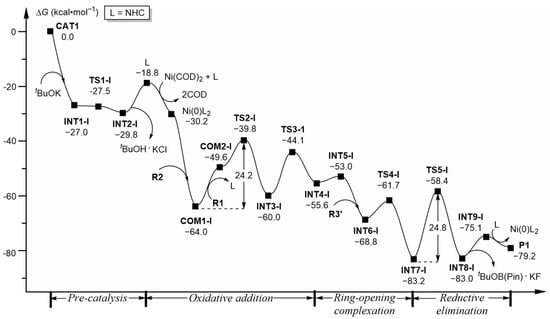 Characterizations of the reaction profile were initiated at the IDSCRF(nHex)-PBE0-D3(BJ)/6-311+G(d,p)-SDD(Ni)//IDSCRF(nHex)-PBE0-D3(BJ)/6-31+G(d)-SDD(Ni) level and showed that the reaction undergoes the following principal steps: pre-catalysis, oxidative addition (OA), ring-opening complexation and reductive elimination (RE). In addition, the third component R3 can easily interact with the tBuOK additive to form a new ‘substrate’ R3′, accompanied by a favorable release of 24.7 kcal·mol−1 of free energies (Figure 1). This signals that the majority of the unreacted substrate R3 should exist in the R3′ form. For reference, R1 + R2 + R3′ is set as the starting point of the catalyzed chemical transformation and assigned a relative free energy of zero (ΔG = 0), with all other energetics expressed relative to this.