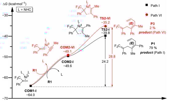 As mentioned in Section 2.1.2, the oxidative addition step (COM2-I → TS2-I, Figure 3) has a regioselectivity-determining role in this reaction. When the asymmetric alkyne (R1) complexes with the nickel center in complex COM1-I in different orientations, another complex COM2-VI may be formed (Figure 8), which is of comparable stability to COM2-I. Nevertheless, the oxidative addition of COM2-VI requires overcoming a total free energy barrier of 28.8 kcal·mol−1 (COM1-I → COM2-VI → TS2-VI), which is 4.6 kcal·mol−1 higher than that of TS2-I on Path I (24.2 kcal·mol−1), justifying the dominant formation of product P1 along Path I. The regioselectivity predictions based on energetic results are in complete agreement with corresponding experimental results (79% of P1 detected at an experimental temperature of 50 °C, while only 2% of the regioisomer P3 could be detected), and they are also consistent with the predictions based on dual descriptors (the C1 site in R1 is more susceptible to the attack of the electrophilic nickel center).