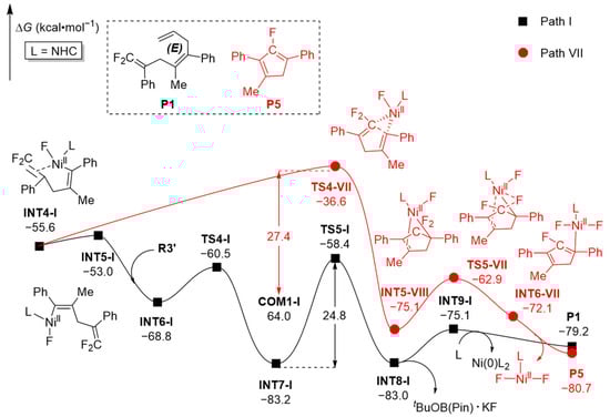 Experiments [14,20] showed that the participation of the third component R3 and the tBuOK additive significantly reduced the catalyst dosage (from 1.0 equiv to 5 mol%) compared to its two-component alternative. Towards resolving the bases of this reduction in catalyst loading, as well as the recycling and regeneration mechanism of the catalyst, we conducted computations on the corresponding two-component reaction (Path VII in Figure 9) at the same level to ensure comparability. In absence of the third component R3 and the tBuOK additive, intermediate INT4-I will undergo C-C coupling (through TS4-VII) along path VII to generate the five-membered ring intermediate INT5-VII, by surmounting a free energy barrier of 27.4 kcal·mol−1. Subsequently, intermediate INT5-VII accomplishes β-F elimination through transition state TS5-VII and converts into intermediate INT6-VII, which may remove a Ni(II)F2L fragment to generate the final product P5. However, in light of the fact that the energy barrier of TS4-VII (27.4 kcal·mol−1) is 2.6 kcal·mol−1 higher than that of the local maximum TS5-I on Path I (24.8 kcal·mol−1), this two-component reaction should be more difficult with respect to the three-component one, albeit it can also still proceed under the corresponding experimental conditions [20].