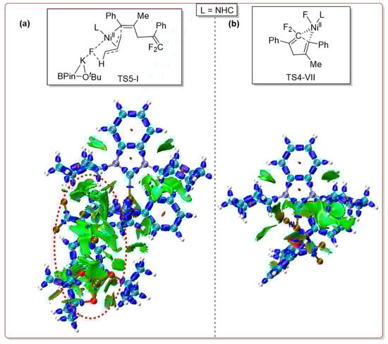 IRI analyses of transition states TS5-I and TS5-V show significant van der Waals interaction (Figure 6, in green) between the leaving fragment (tBuOB(Pin)·KF) and the remaining part of transition state TS5-I, translating to TS5-I being a more stable structure than TS5-V. Additionally, negligible steric hindrance (in red) can be seen in both molecular graphics, which suggests that the electronic effect is the key factor determining the reaction rate here.