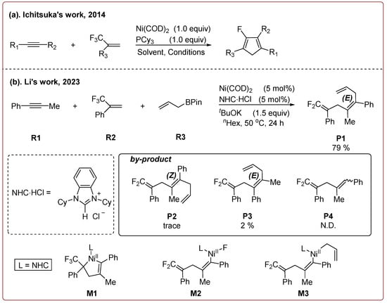 In 2014, Ichitsuka and co-workers prepared 2-fluoro-1,3-cyclopentadienes under mild conditions by using trifluoromethyl olefins and alkynes as substrates, assisted by Ni(0)/PCy3 species (Scheme 1a) [20]. This reaction can lead to cyclopentadiene frameworks directly and regioselectively, yet it requires 1.0 equiv of the nickel catalyst. Recently, Li and co-workers synthesized skip trienes (P1) by employing trifluoromethyl alkenes (R1), alkynes (R2) and allylboronate (R3) as substrates, realizing good yields (up to 83%) and high regio- and stereo-selectivities under mild conditions with the help of a Ni(0)/NHC catalytic system (Scheme 1b) [14]. It involved a third component (allylboronic acid pinacol ester) and potassium t-butoxide (tBuOK) additive, featuring a low dosage (5 mol%) of the nickel catalyst Ni(COD)2; it was favorable relative to Ichitsuka’s 1.0 equiv.