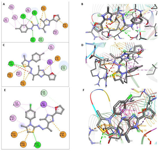 Although all the tested compounds have been slid into the same position as the ligand, only three compounds (3a, 8a, and 8b) interacted with the key amino acids THR173, ARG144, and ASP81 of the active pocket of S. aureus DNA gyrase B (PDB: 3U2D). Compound 3a demonstrated three conventional hydrogen bonds through (C=S), NH with the side chain residues THR173, ARG144, and ASP81 of the active pocket of S. aureus DNA gyrase B (PDB: 3U2D) (Figure 2A,B). Compound 8a showed one hydrogen bond with the key amino acid ARG144 and was linked with the key amino acid (ASP81) via pi–cation interaction (Figure 2C,D). Also, compound 8b exhibited a hydrogen bond with the key amino acid ARG144 besides pi–cation interaction with ASP81 (Figure 2E,F) (Table 5).