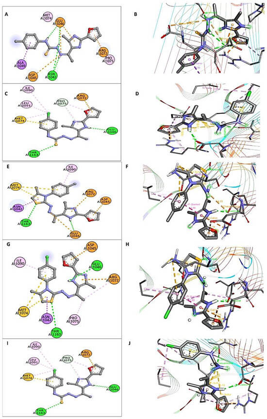 (A,C,E,G,I): The 2D representation of the active compounds 3a, 3b, 8a, 8b, and 10b inside the active cave of E. coli DNA gyrase B (PDB: 1S14). (B,D,F,H,J): The 3D configuration of the active compounds 3a, 3b, 8a, 8b, and 10b inside the active cave of E. coli DNA gyrase B (PDB: 1S14).