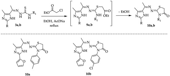 A mixture of carbothioamide derivatives 3a or 3b (1 mmol, 0.353 or 0.374 g), ethyl bromoacetate (1 mmol, 0.167 g), and sodium acetate (3 mmol, 0.246 g) in absolute ethanol (25 mL) was subjected to reflux for 2–3 h (TLC). The precipitate was acquired using filtration, followed by ethanol washing and recrystallization from EtOH, resulting in the formation of compounds 10a and 10b.