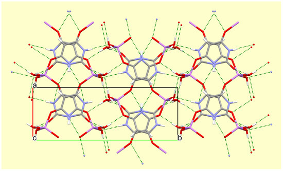 Synthesis of [Li(BA)(H2O)2]∞ (1): barbituric acid (0.264 g, 2 mmol) was dissolved in 15 cm3 distilled water. Solid Li2CO3 (0.074 g, 1 mmol) was added to the solution, which was heated to boiling. When the solid had dissolved and effervescence had ceased, the solution was set aside to cool. Slow solvent evaporation over a period of approximately two weeks resulted in large colourless lath-shaped crystals of 1 (0.066 g, 28.8%). Found C, 27.91; H, 3.97; N, 15.85%. C4H7LiN2O5 requires C, 28.25; H, 4.15; N, 16.47%.