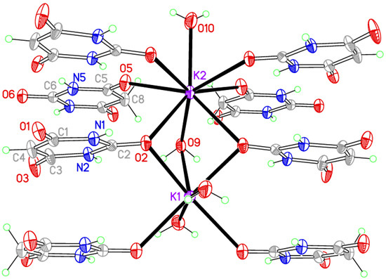 Synthesis of [K(BA)]∞ (5): barbituric acid (0.126 g, 1 mmol) was dissolved in 15 cm3 distilled water. Solid K2CO3 (0.135 g, 1 mmol) was added to the solution, which was heated to boiling. When the solid had dissolved and effervescence had ceased, the solution was set aside to cool. Small clusters of colourless crystals of 5 grew in the sealed vial after one month (0.096 g, 57.8%). Found C, 28.86; H, 1.82; N, 16.54%. C4H3KN2O3 requires C, 28.91; H, 1.82; N, 16.86%.