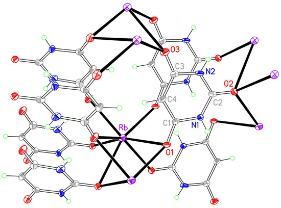Synthesis of [Rb(BA)]∞ (6): barbituric acid (0.131 g, 1 mmol) was dissolved in 20 cm3 distilled water. Rb2CO3 (0.232 g, 1 mmol) was dissolved in 10 cm3 cold distilled water and added to the barbiturate solution. After boiling until approximately 20 cm3 remained, the solution was set aside to cool undisturbed. Clusters of small colourless crystals of 6 grew over a period of one week (0.103 g, 48.5%). Found C, 22.67; H, 1.57; N, 13.11%. C4H3N2O3Rb requires C, 22.60; H, 1.42; N, 13.18%.
