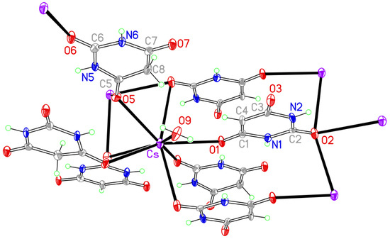 Synthesis of [Cs(BA)(BAH)(H2O)]∞ (8): barbituric acid (0.132 g, 1 mmol) was dissolved in 20 cm3 distilled water. CsOH·H2O (0.089 g, 0.5 mmol) was dissolved in 10 cm3 cold distilled water and added to the barbiturate solution. After boiling until approximately 20 cm3 remained, the solution was set aside to cool undisturbed. Slow evaporation of the solvent over four days resulted in clusters of small colourless crystals of 8 (0.103 g, 50.8%). Found C, 23.52; H, 2.21; N, 13.35%. C8H9CsN4O7 requires C, 23.66; H, 2.23; N, 13.80%.