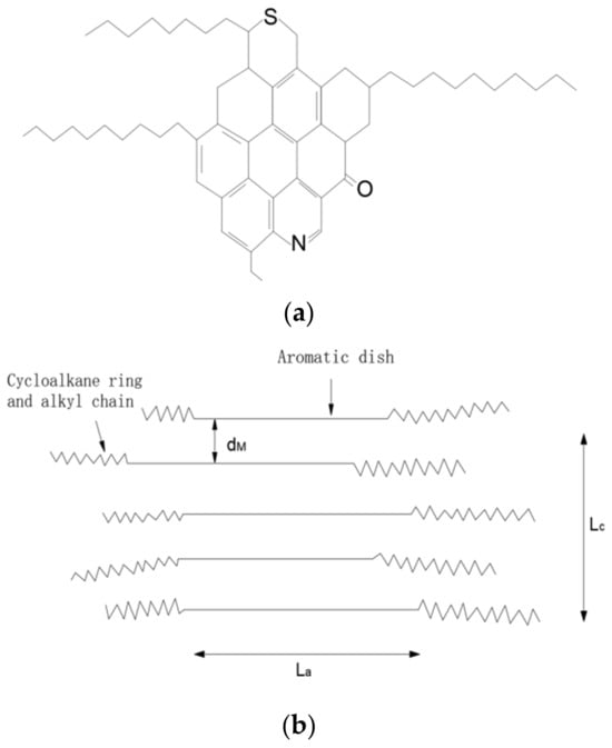 Due to the abundance of aromatic structures in asphaltene and resin, they exhibit relatively low hydrogen-to-carbon ratios, with asphaltene having a lower ratio compared to resin. The hydrogen-to-carbon ratio of resin is generally around 1.4, while for asphaltene, it ranges approximately between 1.1 and 1.3. Determining the average relative molecular weight of resin and asphaltene is a challenging task due to the presence of numerous heteroatoms in their molecular structures. The association between different molecules leads to the formation of supramolecular structures at various levels. Consequently, data obtained using different measurement methods can vary significantly. Therefore, it is crucial to specify the conditions and methods used when providing data on the average relative molecular weight of resin and asphaltene. Only data obtained using the same method under equivalent conditions can be considered comparable. The vapor pressure osmometry (VPO) method, which employs vapor pressure permeation, is commonly used to measure the average relative molecular weight [8,9,10]. The basic structure of resin and asphaltene molecules in petroleum consists of a dense aromatic ring system as the core, with multiple fused aromatic rings, surrounded by several cycloalkane rings. These aromatic and cycloalkane rings are attached to various length-variant normal or isomeric side chains. The molecular branches or ring systems may contain elements such as sulfur (S), nitrogen (N), and oxygen (O) and trace amounts of metal elements, as shown in Figure 1a [11,12,13]. This core structure, composed of a fused aromatic ring system, is the fundamental unit of resin and asphaltene molecules, also referred to as the unit structure or unit sheet. A resin or asphaltene molecule is composed of several such unit structures connected by methylene bridges of varying lengths, with oxygen or sulfur present between these bridge structures. Compared to resin, asphaltene has a higher average relative molecular weight and a higher level of aromatization. In terms of the number of rings per unit structure, asphaltene significantly exceeds resin. The resin unit structure contains approximately five aromatic rings, while the asphaltene unit structure contains around seven to ten aromatic rings. The aromatic rings in asphaltene primarily undergo peri-condensation, while in resin, both peri-condensation and kata-condensation occur between aromatic rings [14,15,16].