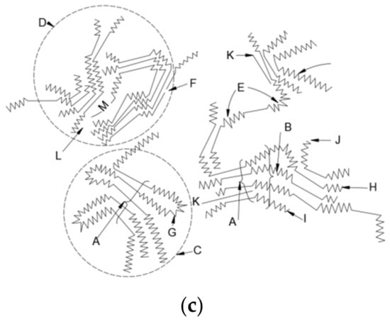 (a) Basic molecular structure of colloidal asphaltenaceous material; (b) asphaltene-like particles with a crystalline structure; (c) schematic diagram of the macroscopic structure of asphaltenes. The straight line indicates the aromatic ring system, and the zigzag line indicates the saturated structure (containing alkanes and naphthenes). A—grain; B—side chain bundle; C—a particle; D—a micelle; E—weak bond; F—one hole; G—intramolecular clusters; H—intermolecular cluster; I—gum; J—a single tablet; K—petroporphyrin; L—metal; M—insoluble component in micelle ; La—average diameter; Lc—stacking height; dM—interlayer spacing.
