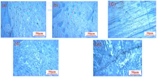 Optical texture picture of modified mesophase pitch with different WFA content. (a) 0%; (b) 1%; (c) 2%; (d) 3%; (e) 5%.