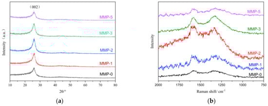 Figure 3 presents the XRD and Raman spectra of five types of mesophase pitch [35,36,37,38,39]. The microcrystalline size parameters of the mesophase pitch, calculated using the Bragg equation and Scheler equation in conjunction with these two characterization methods, are provided in Table 2. From Figure 3a, it is evident that all five mesophase pitches exhibit high-intensity carbon (002) diffraction peaks around 2θ = 25°. This indicates that these asphalts possess a significant degree of molecular orientation. The intensity order of the carbon (002) surface diffraction peaks for the five mesophase pitch is as follows: MMP-0 < MMP-1 < MMP-5 < MMP-3 < MMP-2, with the corresponding 2θ values following the order: MMP-0 < MMP-1 < MMP-5 < MMP-3 < MMP-2. Furthermore, by employing the Bragg equation and Scheler equation, the stacking height (Lc) and molecular spacing (d002) of the molecular layers were calculated. As the 2θ value increases, the corresponding Lc value increases while the d002 value decreases, indicating a higher level of orderliness in the product. Table 2 reveals that with an increase in the proportion of WFA, the (002) diffraction peak initially shifts towards higher angles and then towards lower angles. This suggests that the structure of the mesophase pitch first tends towards orderliness and subsequently transitions to disorderliness. Notably, MMP-2 exhibits the highest 2θ value, indicating that when the WFA addition reaches 2%, the resulting mesophase pitch attains the highest degree of orderliness. To summarize, the content of WFA can alter the regularity of the carbon layer in pyrolysis products. What is more, the orderliness of mesophase pitch products primarily depends on their distinct molecular chemical compositions and molecular configurations.