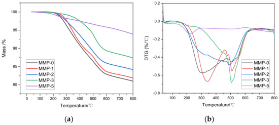 The graphs displayed in Figure 5 illustrate the thermogravimetric (TG) and derivative thermogravimetric (DTG) curves of mesophase pitch. From the figure, it can be seen that the pyrolysis of the product is divided into two stages. The first stage is between 200–570 °C, and the five types of mesophase pitch exhibit weight loss starting at approximately 200 °C. This reduction in sample mass primarily stems from the evaporation of light components and volatile substances. As the temperature reaches 380 °C, the sample experiences a continual decrease in mass due to molecular dissociation and dehydrogenation. The second stage is at 570–800 °C. Low molecular weight gases (various alkanes) are mainly produced through side chain cracking reactions, polymerization reactions, and aromatization reactions, and the weight loss curves of the five mesophase pitches begin to stabilize. In the absence of WFA in the reaction system, the carbon yield of mesophase pitch is minimal. However, with an increasing proportion of WFA, the carbon yield of mesophase pitch gradually rises. This observation suggests that WFA can enhance the thermal stability of mesophase pitch. The reason for this phenomenon is that the addition of WFA can effectively promote the thermal polymerization reaction. Notably, when the WFA ratio reaches 5%, the carbon yield can reach a substantial value of up to 93%. These findings provide evidence that an appropriate amount of WFA can stimulate thermal polymerization reactions [43,44]. For applications requiring improved thermal stability of the reaction system, it is advisable to explore suitable co-carbonizing agents that facilitate the transformation of small molecules into planar molecular structures during thermal decomposition.