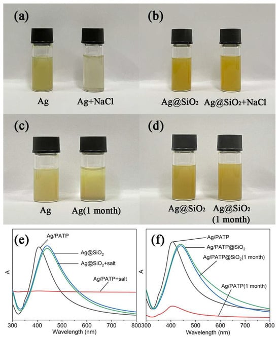 The variation in the appearance of Ag and Ag@SiO2 colloids was directly observed regardless of the presence or absence of NaCl, as shown in Figure 3a,b. The prepared Ag and Ag@SiO2 colloids presented greenish–yellow appearance. After mixing with NaCl solution, the appearance of the Ag colloid almost changed to apparent, which was due to the aggregation of Ag nanoparticles. The UV–vis spectra were also employed for determining the plasmonic feature of Ag and Ag@SiO2 before and after mixing with the NaCl solution (Figure 3e). The adsorption strength of the Ag colloid decreased dramatically after the addition of the NaCl solution, while the adsorption spectra of Ag@SiO2 nearly remained unchanged after adding the NaCl solution. The stability of Ag@SiO2 in the salt solution assigned to the silica shell protected the Ag core.