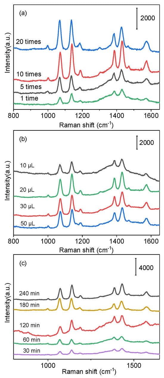As more of Au NPs bind to the SiO2 shell, the corresponding amount of L-cysteine absorbed on Au NPs also increases, indirectly providing an opportunity for the interaction between L-cysteine and Cu2+. A low concentration of the Au colloid indicates a relatively small number of Au NPs, which means that the probability of L-cysteine binding to Cu2+ is greatly reduced. The weak SERS signal was obtained when original Au colloids were used. A strong Raman peak can be observed in Figure 4a as the Au colloids were concentrated 10-fold. On the contrary, higher concentration of Au nanoparticles in a certain area inhibits the generation of the SERS signal. The intensity of the SERS signal was decreased as the 20-fold-concentrated Au colloid was used for constructing Ag@SiO2/Au. Therefore, the 10-fold-concentrated Au colloids were selected in the subsequent experiment. Different amounts of L-cysteine (10 μL, 20 μL, 30 μL, 50 μL) were used to functionalize the surface of Ag@SiO2/Au. As a kind of α-amino acid, L-cysteine is composed of sulfydryl, carboxyl, and the amino group. L-cysteine could be modified on Au nanoparticles through the S-Au bond; after being immersed in a solution of the Cu2+ ions, the iminoacetic acid group can strongly coordinate with Cu2+ [43]. And the Cu2+-conjugated Ag@SiO2/Au nanoparticles can easily crosslink to the L-cysteine-functionalized substrate through the coordination interactions between L-cysteine and Cu2+. It can be seen that the most intense SERS signal was obtained when 20 μL L-cysteine was used in the system (Figure 4b). The Raman signal without significant enhancement was obtained with the increase in the amount of L-cysteine because the surface of Au nanoparticles was fully occupied.