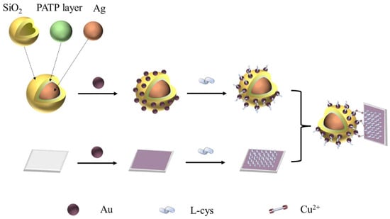 Surface-enhanced Raman spectroscopy (SERS) is a simple, nondestructive, convenient, instant, and highly sensitive analytical method. The greatly enhanced signal-enabled SERS can detect an analyte with a lower concentration, even down to molecule level [13,14]. SERS could provide unique fingerprint spectrum information of the target; it is widely used in many fields such as pharmacology [15,16], food safety [17,18], environmental monitoring [19], and bioengineering [20]. The preparation of appropriate SERS substrates is an important prerequisite for application [21,22]. The research on the SERS substrate with core–shell structure has recently made progress in the field of materials science [23]. Tian and his team [24] pioneered a method of wrapping ultra-thin silica shells on the surface of Au nanoparticles (SHINERS). The diversity of silica shell materials includes controllable shell size, ensuring the stability of nuclear nanoparticles, and functionalized modification of the core–shell structure, making it an ideal SERS substrate [25]. As the metallic ions such as Cu2+ have no Raman signal [26], the use of the Raman labeling method in SERS detection is necessary. Shen et al. [27] used embedded Raman probe molecules (core–molecule–shell) in the core–shell SERS tag and employed it for a quantitative analyzing target molecule.