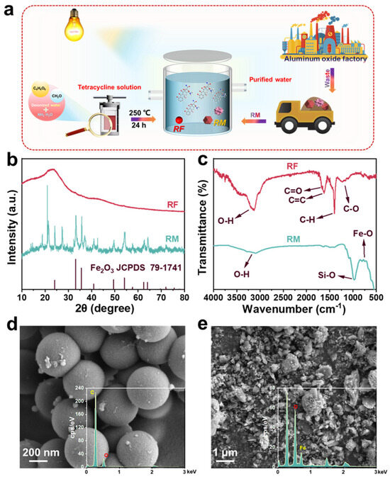 (a) Schematic diagram of RF/RM photo-self-Fenton degradation system. (b) XRD patterns and (c) FT-IR spectra, (d) SEM images, and (e) corresponding EDX spectra of RF and RM.