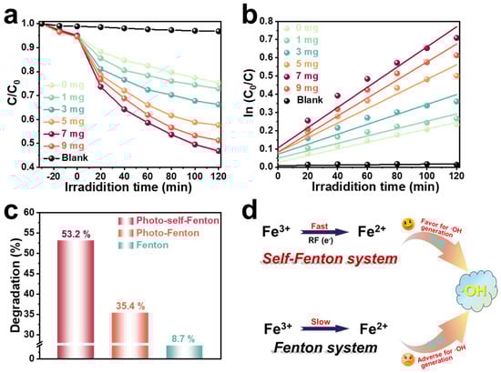 The degradation performance of the heterogeneous RM/RF photo-self-Fenton system was estimated via tetracycline (TC) degradation under visible light (λ > 400 nm) illumination. The concentration of Fe species is one of the prerequisites for turning on the Fenton reaction [32], so the effect of different amounts of RM on the TC degradation performance of RF-based photo-self-Fenton system was explored (Figure 2a). As shown in Figure S3, the adsorption equilibrium was reached by adsorption after 30 min in the dark, excluding the interference of adsorption to the catalytic reaction. It is clearly observed that the degradation performance was improved significantly with the addition of RM, and the degradation performance reached the optimum and the degradation rate reached 53.2% with the addition of 7 mg of RM, which was due to the efficient utilization of H2O2 promoted by the activation by RM. Nevertheless, the employ of excess iron source would similarly inhibit the degradation of TC, as the excess RM could agglomerate, thereby blocking the light absorption of RF during stirring [33,34]. Furthermore, the corresponding pseudo-first order kinetic curves are displayed in Figure 2b; regarding the fitted degradation, the apparent reaction rate constants of k (min−1) are given in Table S2. Similarly, the kinetic reaction rate of the photo-self-Fenton degradation system with the addition of 7 mg of RM achieved a distinct increase of about 3.03 times compared to that of the pure RF photocatalytic system, which was consistent with the above results. Notably, it was crucial to determine whether the improved degradation performance stemmed from the material’s photocatalytic properties or whether it was acting as an H2O2 activator of RM in the self-Fenton system, since RM is a collection of various semiconductor materials. As provided in Figure S4, the TC degradation performance of RM with/without adding RF was compared under the photo-reaction conditions, and it was discovered that the increase of the photocatalytic degradation rate of pure RM was much less than that of the photocatalytic self-Fenton system after the addition of 20 mg RF with the increase of RM, which can fully confirm the role of RM as photocatalysts and H2O2 activators in the photocatalytic self-Fenton system. Meanwhile, the TC degradation performance was contrasted with common Fenton, photo-Fenton and photo-self-Fenton systems, as shown in Figure 2c, and it was concluded that the photo-self-Fenton system possessed the best degradation efficiency of TC under visible light irradiation, which is 1.52 and 6.11 times that of Fenton and photo-Fenton systems, respectively. Compared with the Fenton reaction, the cause of the enhanced performance of the self-Fenton reaction is the faster valence state circulation of iron ions to further affect the rate of hydroxy radical (•OH) formation of the major degradative active species (Figure 2d) [35], which is ascribed to the following reasons: (i) compared with ordinary Fenton systems, photo-self-Fenton systems employ semiconductor materials as the catalyst, which are excited by the external light source to produce photo-induced electrons, and thus quickly realize the valence state transition to activate H2O2 to produce •OH [36]; (ii) simultaneously, electrons participate in the formation of H2O2 intermediates and provide raw materials for iron ion conversion [37]; (iii) in contrast, although both use the assistance of photocatalysis, the in situ generation of H2O2 in self-Fenton system increases the H2O2 content in the fixed environment, thus facilitating the valence cycle and H2O2 activation to produce highly oxidized •OH, compared with photo-Fenton systems.