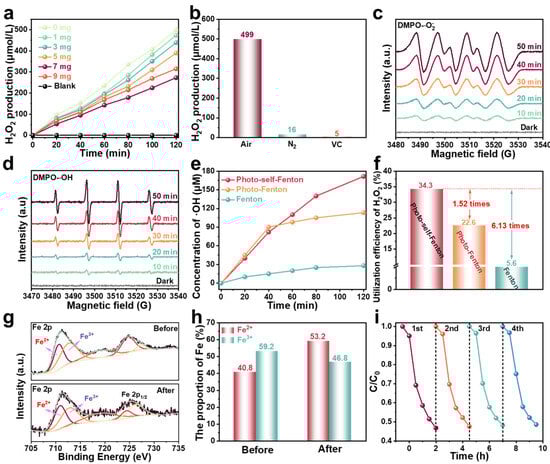 (a) Concentration of H2O2 produced by RF/RM photo-self-Fenton systems with different amounts of RM under visible light irradiation. (b) H2O2 production of RF under controlled experimental conditions. (c) ESR spectra of (c) DMPO-•O2− and (d) DMPO-•OH on RF/RM photo-self-Fenton system under different irradiation time. (e) Variation curves of •OH radial concentration and (f) utilization efficiency comparison of H2O2 over Fenton, photo-Fenton, and photo-self-Fenton systems. (g) High-resolution XPS spectra of Fe 2p and (h) the corresponding proportion of Fe for the RM before and after photocatalysis–self-Fenton degradation reaction. (i) Reusability of RF/RM photo-self-Fenton system.