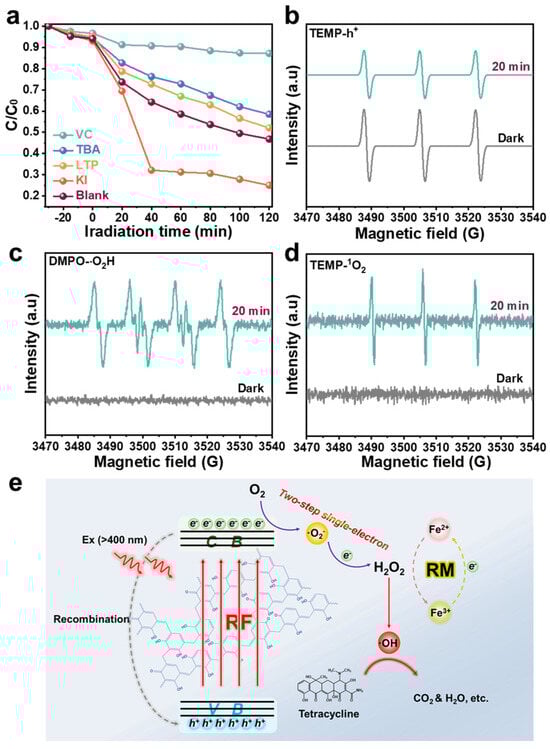 In general, the photocatalytic degradation performance relies on the varieties and amount of active free radicals available during the degradation process, such as •O2−, •OH, singlet oxygen (1O2), and holes (h+) [47]. To further comprehend the mechanism of the TC degradation process, the free radical capturing experiments were carried out on the degradation system via adding vitamin C (VC), tert-butanol (TBA), L-tryptophan (LTP), and potassium iodide (KI) as capture •O2−, •OH, 1O2, and h+. As exhibited in Figure 4a and Figure S10, the final degradation rates of TC were effectively suppressed by 12.85% and 41.54% after the addition of VC and TBA, respectively, which indicates that •O2− and •OH are the main active free radicals in the RF/RM photo-self-Fenton system. Unlike the strong oxidation function of •OH, •O2− acts as an intermediate of H2O2 and suppresses the degradation efficiency by inhibiting H2O2 production. The degradation rate decreased slightly after the introduction of LTP, indicating that 1O2 is not the main reactive oxygen species (ROS) during the photo-Fenton process. Contrarily, the degradation efficiency, which increased significantly with h+, was captured by KI, indicating that the h+ plays a role in inhibiting degradation in this photo-self-Fenton system, rather than participating in the ring-opening reaction of TC as an oxide species to enhance the degradation effect, which could be due to the obstruction of the valence transition of iron and the inhibition of H2O2 generation and transformation related to recombination of photo-generated carriers [48]. As a supplement to the free radical capturing experiments, ESR spectra have been measured to detect the •O2−, •OH, h+, •O2H, and 1O2 with 5,5-dimethyl-1-pyrroline N-oxide (DMPO) and 2,2,6,6-tetramethyl-4-piperidine (TEMP) in this system [49], which are provided in Figure 3c,d and Figure 4b–d. Uniformly, there was no characteristic signal of DMPO-•OH, DMPO-•O2−, TEMP-1O2, or DMPO-•O2H in darkness, while after 20 min of visible irradiation, strong signals from DMPO-•OH, DMPO-•O2−, TEMP-1O2, and DMPO-•O2H could be observed, confirming the presence of •OH,•O2−, 1O2, and •O2H during the photo-self-Fenton degradation process of the RF-based heterogeneous system. The appearance of •O2H confirms that the reduction of Fe3+is not only involved in obtaining electrons (e− + Fe3+ → Fe2+), but also in the reduction reaction in H2O2 decomposition (Fe3+ + H2O2 → Fe2+ + •O2H + H+, k = 0.001–0.01 L·mol−1 s−1), although this reaction is difficult and often ignored, owing to the slowness of the kinetic reaction. For the ESR spectra of h+, it was clearly observed that the signal of h+ became weaker, thus illustrating the recombination behavior of the electron-hole pairs within 20 min. Accordingly, the possible reaction mechanism of the RF-based photo-self-Fenton degradation system can be deduced (Figure 4e). The first occurrence was the photocatalytic process that RF photocatalysts being excited to generate electron-hole pairs by visible light and further produce H2O2 via a two-step single-electron ORR (O2 + e− → •O2−, •O2− + e− + 2H+ → H2O2) with the separated photo-electrons [50,51]. For the Fenton process, Fe3+ ions in the RM were reduced to Fe2+ ions via reacting with photo-electrons, and the formation of •OH was further realized via activating H2O2 to degrade antibiotic target (TC) as well as the valence cycle of Fe ions (Fe2+ + H2O2 → Fe3+ + •OH + OH−). Nevertheless, the position of VB for RF is more negative than the conversion potential between •OH and H2O (2.4 eV), thus excluding the WOR path of •OH (OH− + h+ → •OH). The photo-self-Fenton system could be operated continuously through the cyclic reaction of H2O2 with Fe2+.
