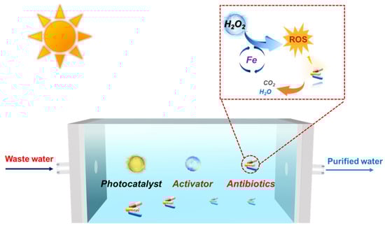 The abuse of antibiotics (e.g., tetracycline) and the stability of their molecular structures lead to their usual detection in natural aquatic systems and causing ecotoxicological effects that have brought many adverse effects to the ecological environment, human health, microbial growth, etc. [1,2,3]. In order to solve the pollution problem of antibiotic wastewater, biological treatment, chemical oxidation, and physical adsorption methods are proposed, but they suffer from high energy consumption, high cost, complex operation, or secondary pollution [4,5,6,7]. Recently, as advanced oxidation processes (AOPs), the rapid expansion of Fe in a 2+ oxidation state (Fe2+) and the hydroxyl radical (•OH)-based Fenton oxidation method, since •OH expresses high redox potential (+2.80 V vs. SHE), for organic matter decomposition [8,9,10] have been broadly applied in antibiotic wastewater treatment. Unfortunately, the conventional homogeneous Fenton method suffers from poor tolerance of pH, high difficulty in separating iron species from water and weak Fe2+ regeneration [11]. Furthermore, the continuous addition of consumable hazardous chemical oxidants (hydrogen peroxide, H2O2) significantly increases expenses and security risks during the process of production and transport, which seriously restricts its actual application in treatment of pollutant wastewater [12]. Accordingly, it is urgent to seek a sustainable method for overcoming the shortcomings of the homogeneous Fenton technique and improving its efficiency without any extra addition of H2O2.